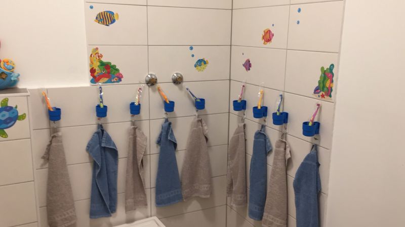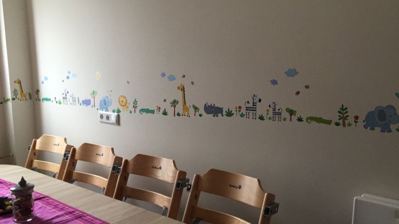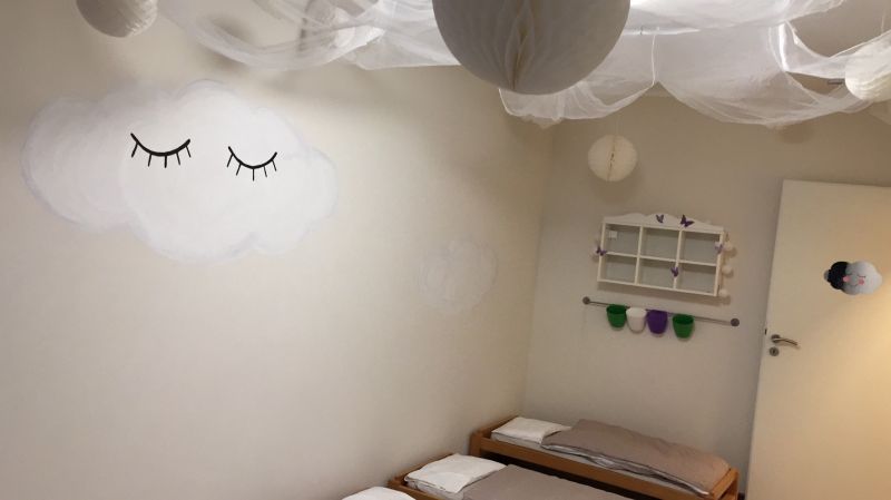 Auf insgesamt 130m² Wohnfläche und ca. 15m² großen Wintergarten haben wir ausreichend Platz. Das Spielhaus mit Podesten und kuscheliger Rückzugshöhle lädt ein zum Träumen und Verstecken. In der Bauecke dürfen die Kinder genauso kreativ wie mit der Verkleidungskiste werden. Ein Kreativraum befindet sich im hellen Wintergarten. Basteltische, Farben, Leinwände laden ein, nach Herzenslust kleine Kunstwerken herzustellen. Eine gemütliche Küche mit Sitzgelegenheiten dient zum gemeinsamen Frühstücken, Mittagessen und für Zwischenmahlzeiten. Wir verfügen über zwei Badezimmer mit WC und Dusche, zusätzlich ausgestattet mit einem Toilettensitz, einem Tritthocker und Haken für Handtücher, Waschlappen und Zahnputzbecher. In einem der Badezimmer befindet sich eine Wickelkommode. Im Schlafzimmer haben wir für jedes Kind ein kleines Bettchen, in das sie selber reinhuschen können; für die ganz Kleinen werden wir Reisebettchen aufstellen, und jedes Kind hat ein persönliches Fach für Kuscheltier, Schnuller, etc..