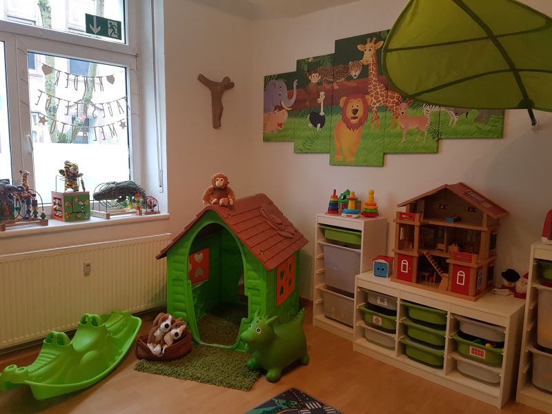 Es gibt ein Spielzimmer mit eingeteilten Bereichen zum Bauen, Puppenecke, Kuschel- und Ruheplatz sowie eine Sitzecke zum malen, basteln, puzzeln und Bücher schauen.