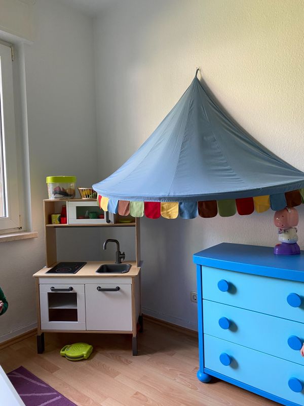 Für die Kindertagespflege steht mir in dem Haus eine kleine Wohnung mit 2 Räumen zur Verfügung. In dem einen wird gegessen und gebastelt, im anderen gespielt und geschlafen.